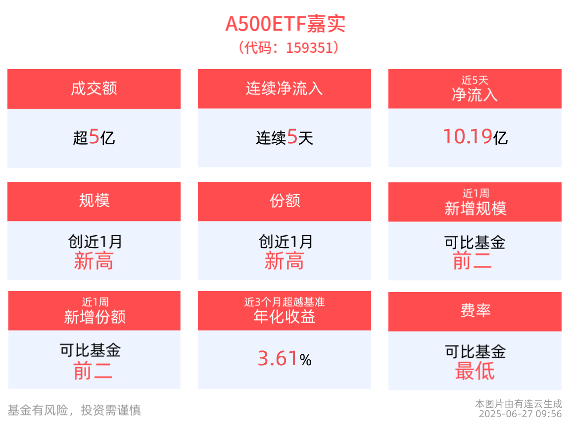 流动性方面,A500ETF嘉实盘中换手3.68%,成交5.79亿元。拉长时间看,截至6月26日,A500ETF嘉实近1周日均成交30.36亿元。