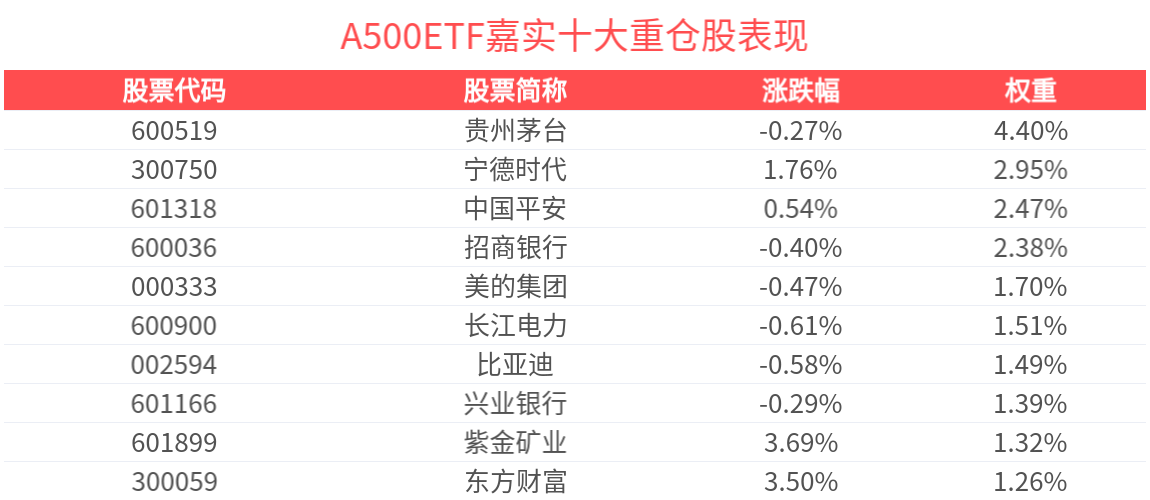 数据显示,截至2025年5月30日,中证A500指数前十大权重股分别为贵州茅台、宁德时代、中国平安、招商银行、美的集团、长江电力、兴业银行、比亚迪、紫金矿业、东方财富,前十大权重股合计占比21.21%。